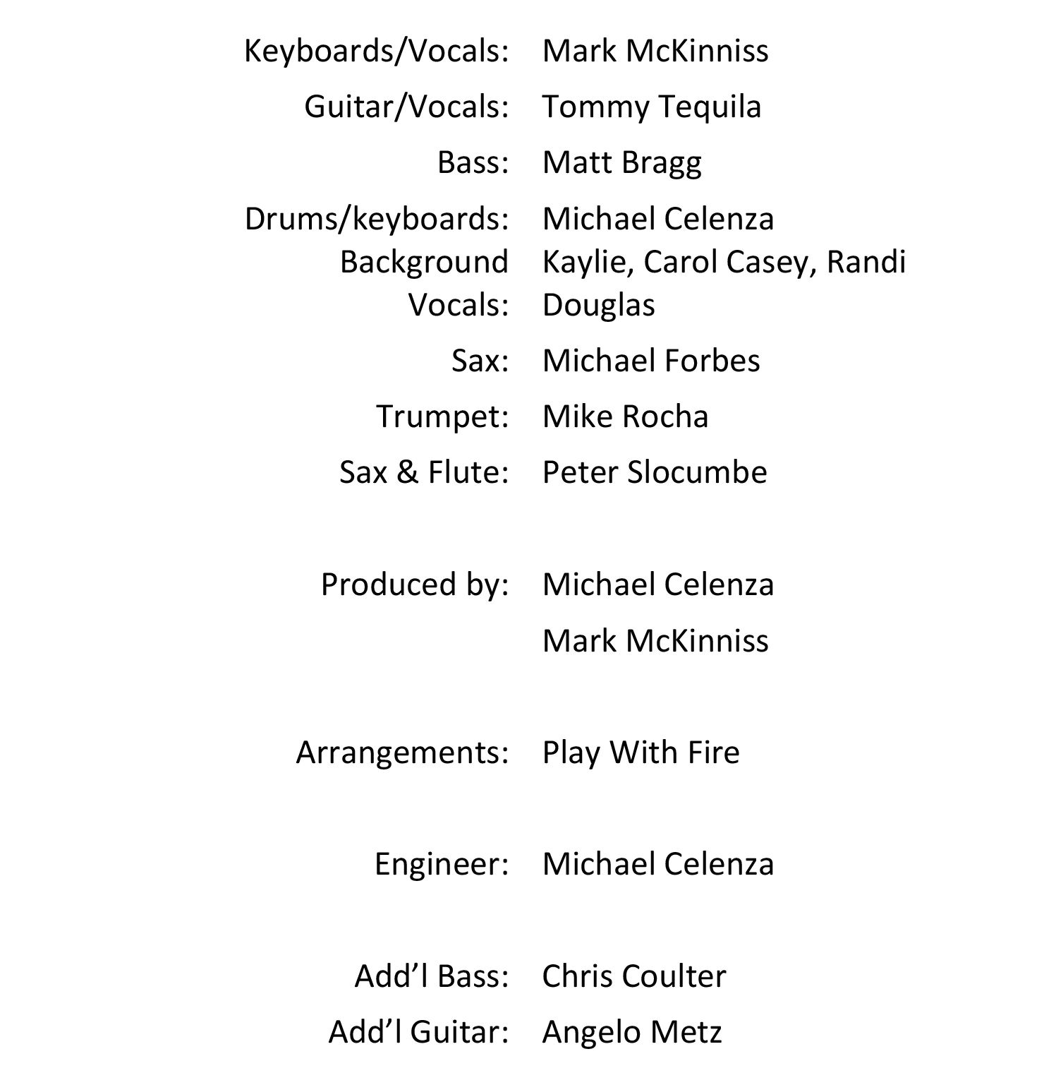 Members of Play With Fire have performed or recorded with: Delaney Bramlett, John Stewart, Bobby Sherman, (Mark); Tom Scott, Chevy Chase, Bill Withers, The Whispers (Matt); 2nd Chapter of Acts, The Forrester Sisters (Michael Celenza); David Gilmour, Alan Parsons (Michael Forbes);
